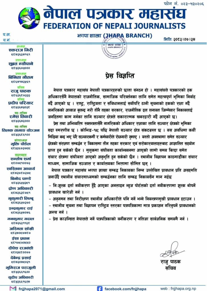 नेपाल पत्रकार महासंघ झापाको प्रेस विज्ञप्ति By fnj jhapaNovember 12, 2025November 12, 2025Press Release नेपाल पत्रकार महासंघ झापाकोप्रेस विज्ञप्ति